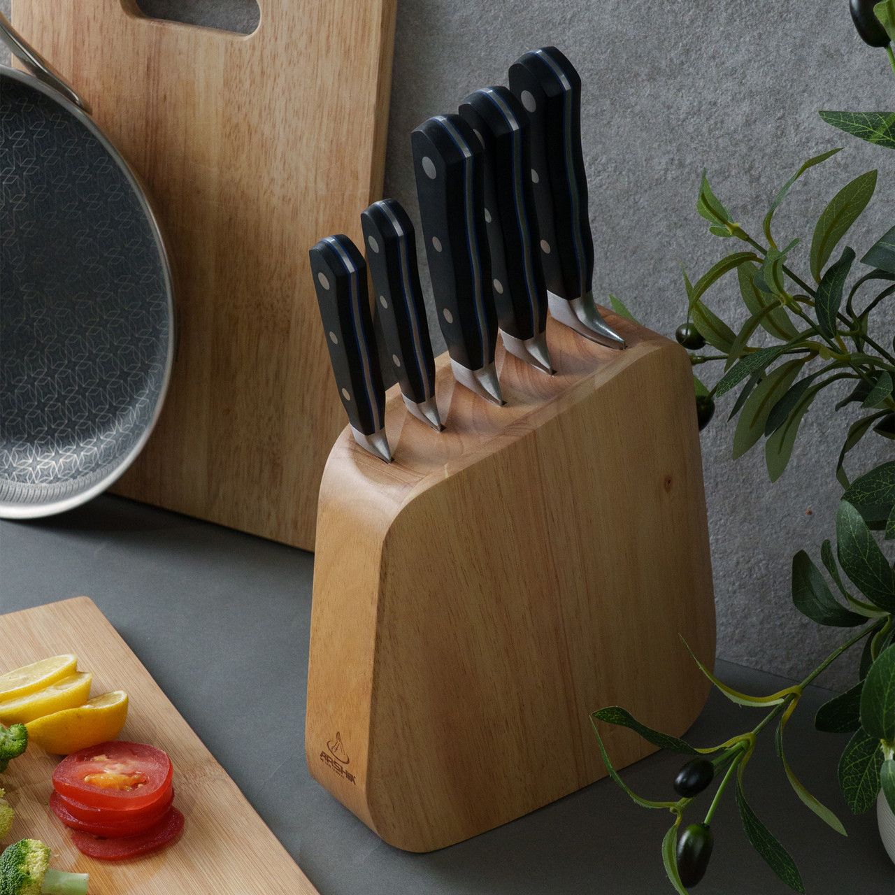 دستههای استیل ارگونومیک، هم از نظر زیبایی و هم از نظر راحتی در استفاده، تجربهای حرفهای را برای کاربر فراهم میکنند. پایه چوبی محکم و جذاب این ست، علاوه بر زیبایی، نگهداری چاقوها را آسانتر و ایمنتر میسازد. این مجموعه برای انواع کارهای آشپزی از برش گوشت و سبزیجات گرفته تا نان و کارهای ظریف بهطور کامل کاربردی است.
