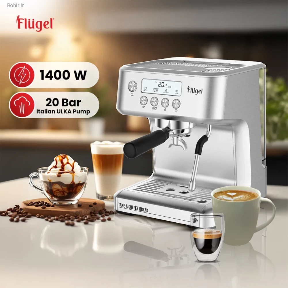 اسپرسوساز فلوگل مدل EM112-6200 با توان 1450 وات و پمپ ایتالیایی ULKA با فشار 20 بار، به شما امکان میدهد اسپرسویی غنی و باکیفیت در خانه تهیه کنید. این دستگاه با پرتا فیلتر 58 میلیمتری، عصارهگیری کامل قهوه را تضمین کرده و طعم و عطر قویتر و کرمای بیشتری به قهوه شما میبخشد. طراحی تمام استیل آن، علاوه بر زیبایی، دوام بالایی نیز دارد. مخزن آب 2.2 لیتری آن برای استفاده طولانیمدت مناسب است. با خرید اسپرسوساز فلوگل، قهوهای با طعم حرفهای و قیمت مناسب خواهید داشت. خرید این دستگاه با بهترین قیمت را از فروشگاه ما تجربه کنید.