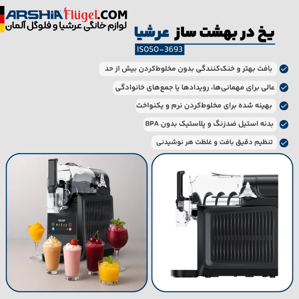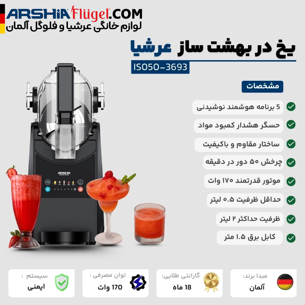 یخ در بهشت ساز عرشیا مدل IS050-3693 یک دستگاه قدرتمند با موتور 170 وات است که به شما این امکان را میدهد تا نوشیدنیهای خنک و خوشمزه مانند یخ در بهشت، میلکشیک و کوکتلهای یخزده را در کمتر از 45 دقیقه آماده کنید. با ظرفیت حداکثر 2 لیتر، این دستگاه مناسب برای مهمانیها و دورهمیهای خانوادگی است. ویژگیهای هوشمند مانند 5 حالت نوشیدنی، کنترل دما و هشدار سنسور مواد، تجربهای عالی را برای شما به ارمغان میآورد.